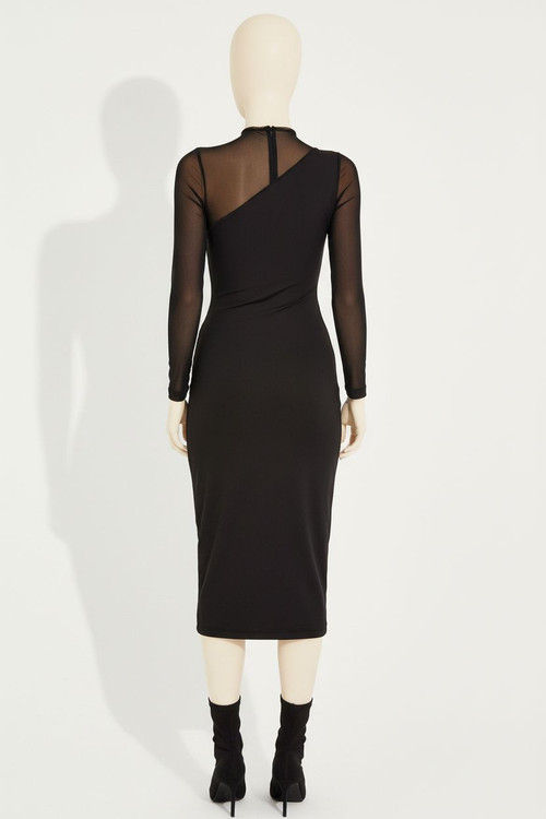 پیراهن مجلسی زنانه مشکی با قد میدی و آستین توری شفاف، طراحی جذب و مدرن مناسب مهمانی و مراسم رسمی. خرید آنلاین جدیدترین مدلهای لباس مجلسی زنانه.