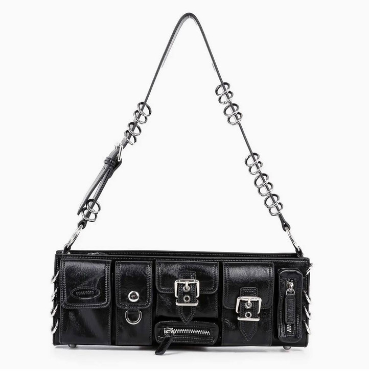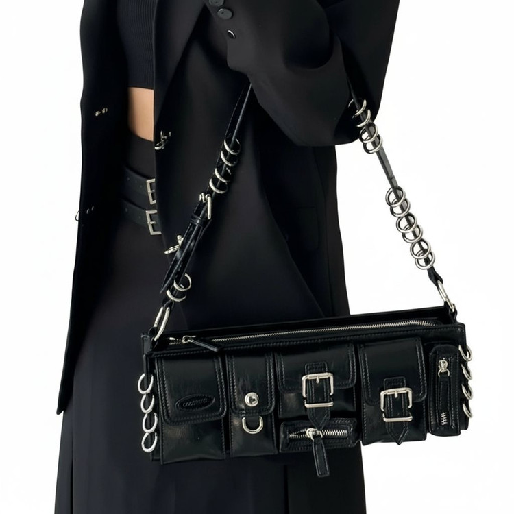 اگر به استایلهای خاص، آلترناتیو و گاتیک علاقه دارید، این کیف زنانه چند جیب مشکی دقیقاً همان اکسسوری متفاوتی است که استایل شما را کامل میکند. طراحی چند جیب کاربردی در قسمت جلو همراه با سگکهای فلزی و جزئیات زنجیری، ظاهری جسور و مدرن به این مدل بخشیده است.