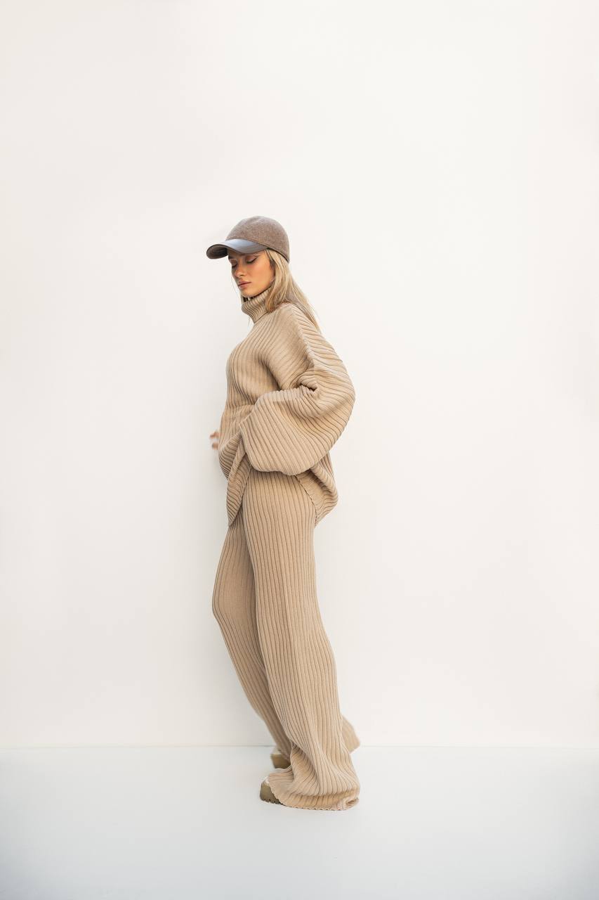 بلوز با آستینهای آزاد و یقه اسکی، جلوهای مدرن و ترند دارد و شلوار با فرم راسته و کمر راحت، استایلی یکدست و مینیمال میسازد. این ست را میتوان با کتانی، بوت یا حتی پالتو بلند برای یک استایل روزمره و شیک ست کرد.