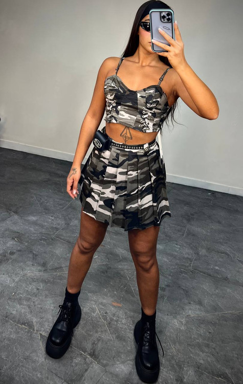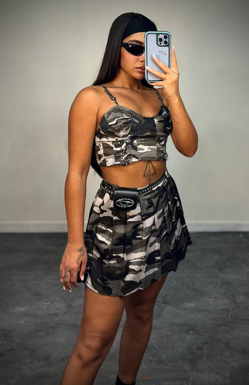 اگر به استایلهای خاص و متفاوت علاقه دارید، این ست تاپ و دامن ارتشی زنانه انتخابی جسورانه و کاملاً ترندی برای شماست. ترکیب تاپ کوتاه بندی با دامن چیندار، یک استایل اسپرت و جذاب ایجاد کرده که برای دورهمی، مهمانیهای دوستانه و استایل خیابانی فوقالعاده است.