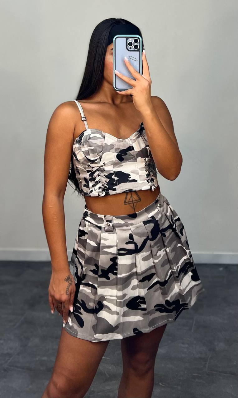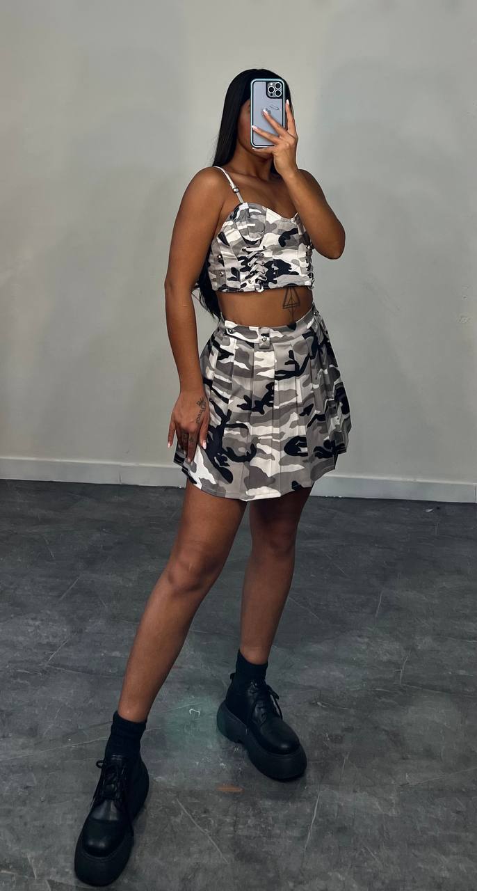اگر به استایلهای خاص و متفاوت علاقه دارید، این ست تاپ و دامن ارتشی زنانه انتخابی جسورانه و کاملاً ترندی برای شماست. ترکیب تاپ کوتاه بندی با دامن چیندار، یک استایل اسپرت و جذاب ایجاد کرده که برای دورهمی، مهمانیهای دوستانه و استایل خیابانی فوقالعاده است.