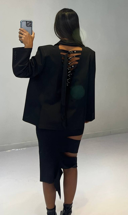 اگر به دنبال یک استایل متفاوت و خاص برای مهمانی و مراسم هستید، این پیراهن مجلسی مشکی برشدار انتخابی جسورانه و مدرن برای شماست. طراحی بدون بند در قسمت بالا، همراه با برشهای افقی ظریف در بدنه لباس، جلوهای خاص و متفاوت ایجاد کرده که استایل شما را بهسادگی از دیگران متمایز میکند. همچنین برای رسمیت بیشتر یک کت همرنگ آن هم در ست لباس قرار دارد.
