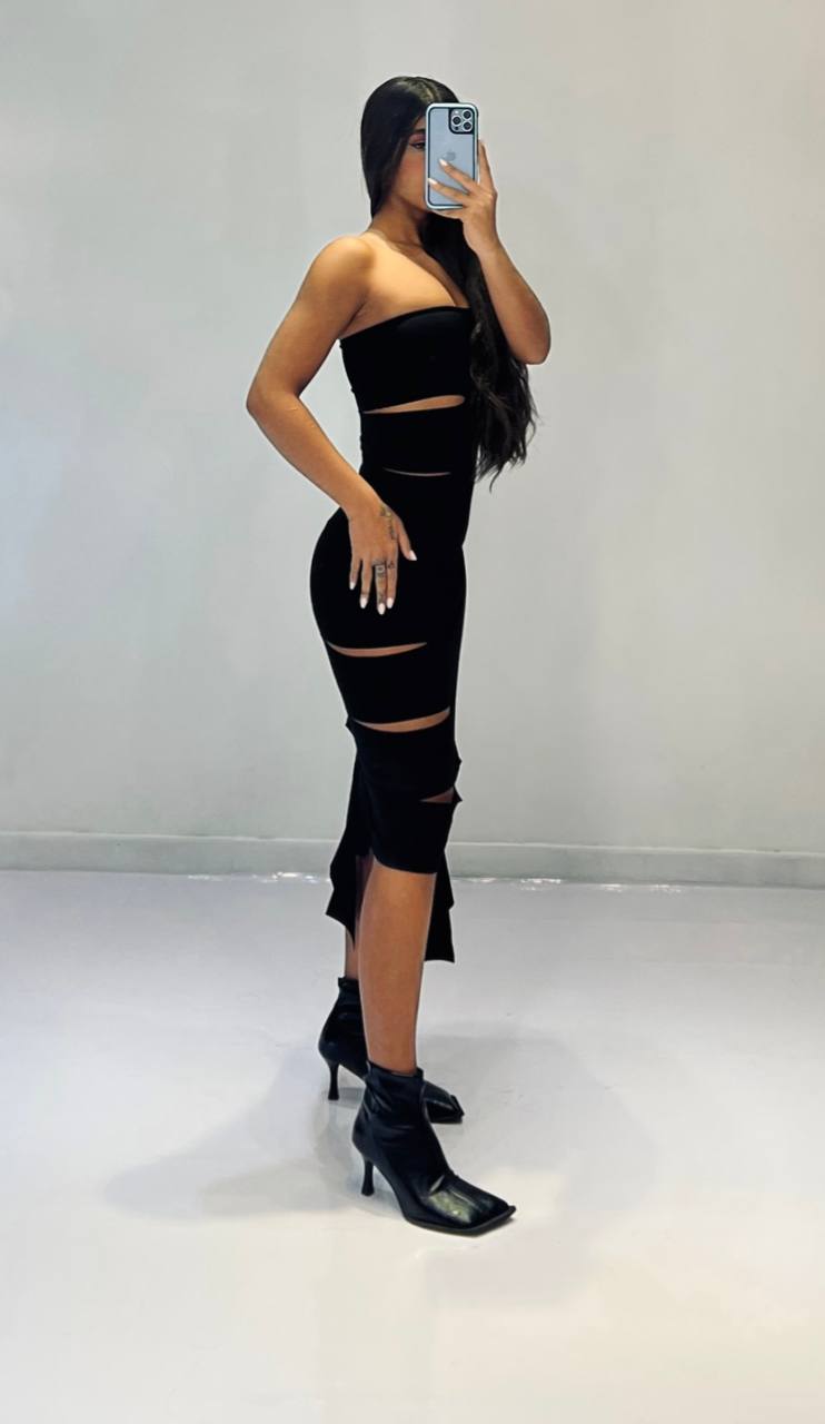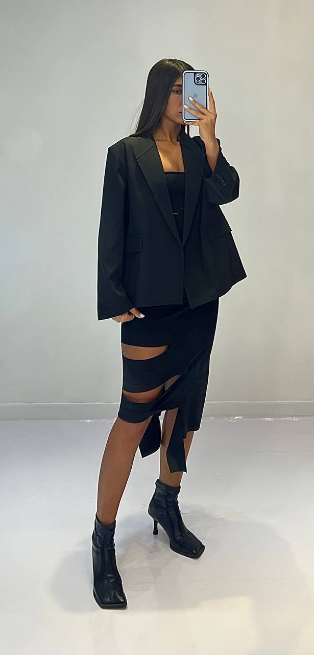 اگر به دنبال یک استایل متفاوت و خاص برای مهمانی و مراسم هستید، این پیراهن مجلسی مشکی برشدار انتخابی جسورانه و مدرن برای شماست. طراحی بدون بند در قسمت بالا، همراه با برشهای افقی ظریف در بدنه لباس، جلوهای خاص و متفاوت ایجاد کرده که استایل شما را بهسادگی از دیگران متمایز میکند. همچنین برای رسمیت بیشتر یک کت همرنگ آن هم در ست لباس قرار دارد.