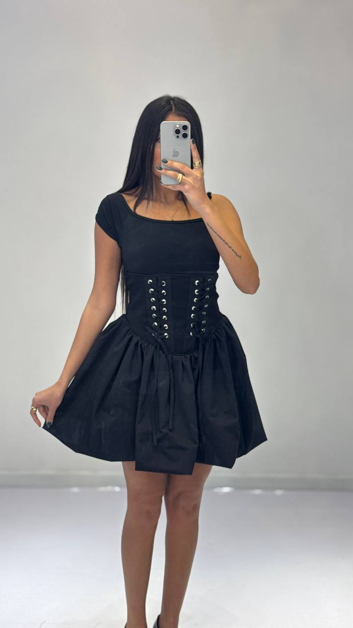 اگر به استایلهای متفاوت و دخترانه علاقه دارید، این پیراهن کوتاه مشکی کرستی انتخابی خاص و ترندی برای مهمانیهای دوستانه و تولد است. طراحی بالاتنه جذب با جزئیات بنددار (الهامگرفته از فرم کرست) در کنار دامن چیندار، ترکیبی جذاب و متفاوت ایجاد کرده که استایل شما را چشمگیرتر نشان میدهد.