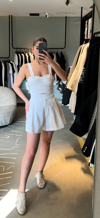 این ست را میتوانید با کتانی سفید، صندل یا کیفهای مینیمال ست کنید و یک استایل ساده و ترند بسازید. رنگ سفید آن باعث میشود پوست روشنتر دیده شود و حس تازگی و لطافت به استایل شما بدهد.