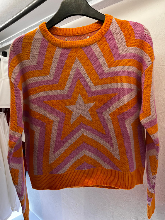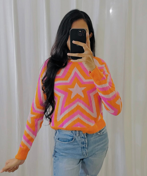 اگر به استایلهای جسور و رنگی علاقه دارید، این پلیور بافت طرح ستاره زنانه انتخابی خاص و پرانرژی برای روزهای سرد سال است. ترکیب رنگهای گرم نارنجی و صورتی در کنار طراحی بزرگ ستاره، جلوهای چشمگیر و متفاوت ایجاد کرده که استایل شما را از حالت ساده خارج میکند.
