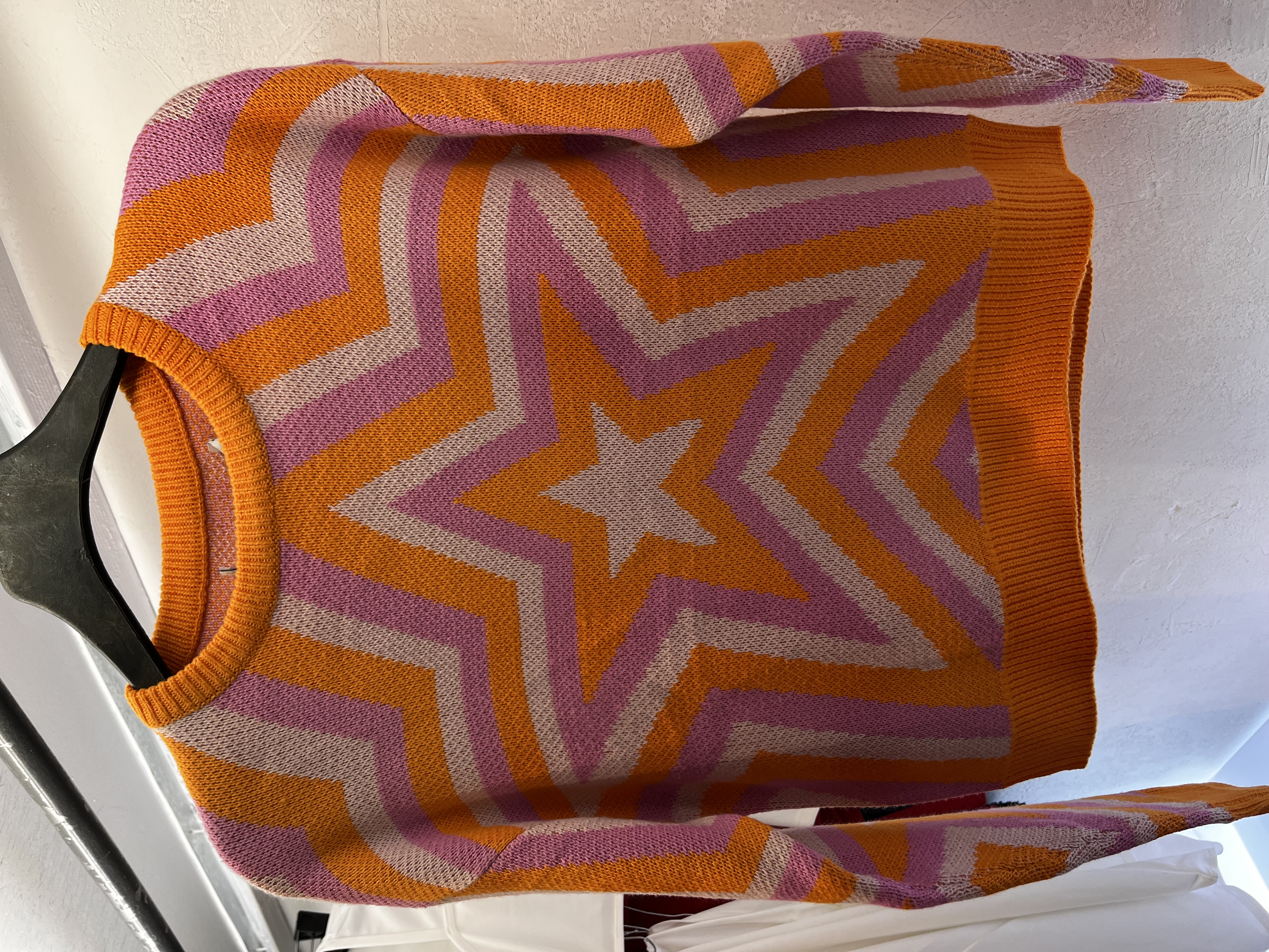 اگر به استایلهای جسور و رنگی علاقه دارید، این پلیور بافت طرح ستاره زنانه انتخابی خاص و پرانرژی برای روزهای سرد سال است. ترکیب رنگهای گرم نارنجی و صورتی در کنار طراحی بزرگ ستاره، جلوهای چشمگیر و متفاوت ایجاد کرده که استایل شما را از حالت ساده خارج میکند.