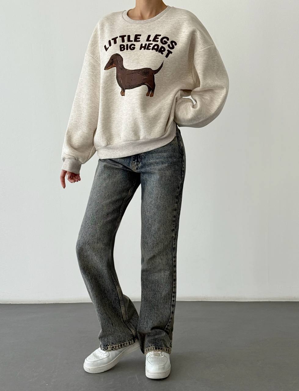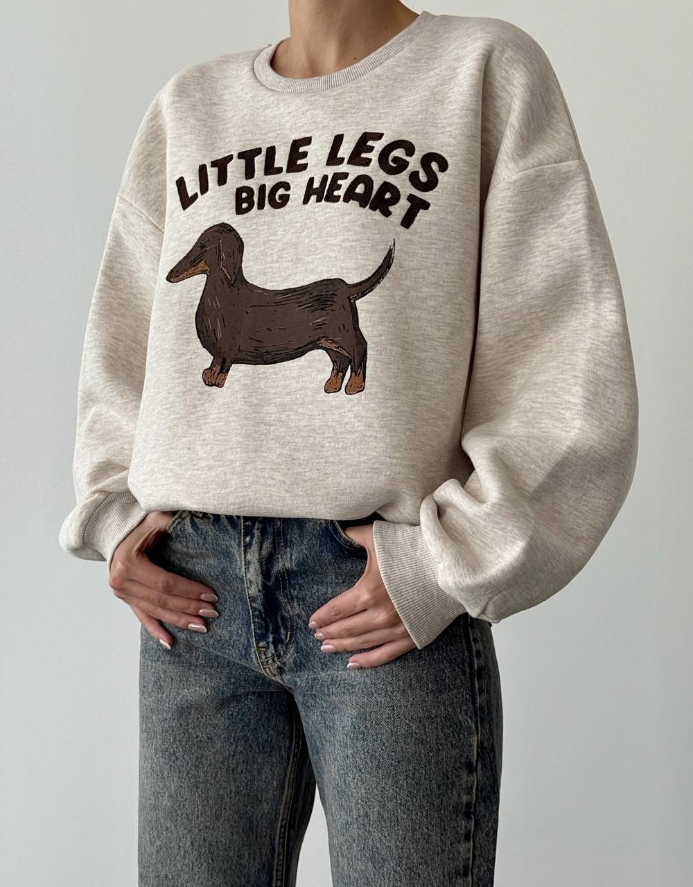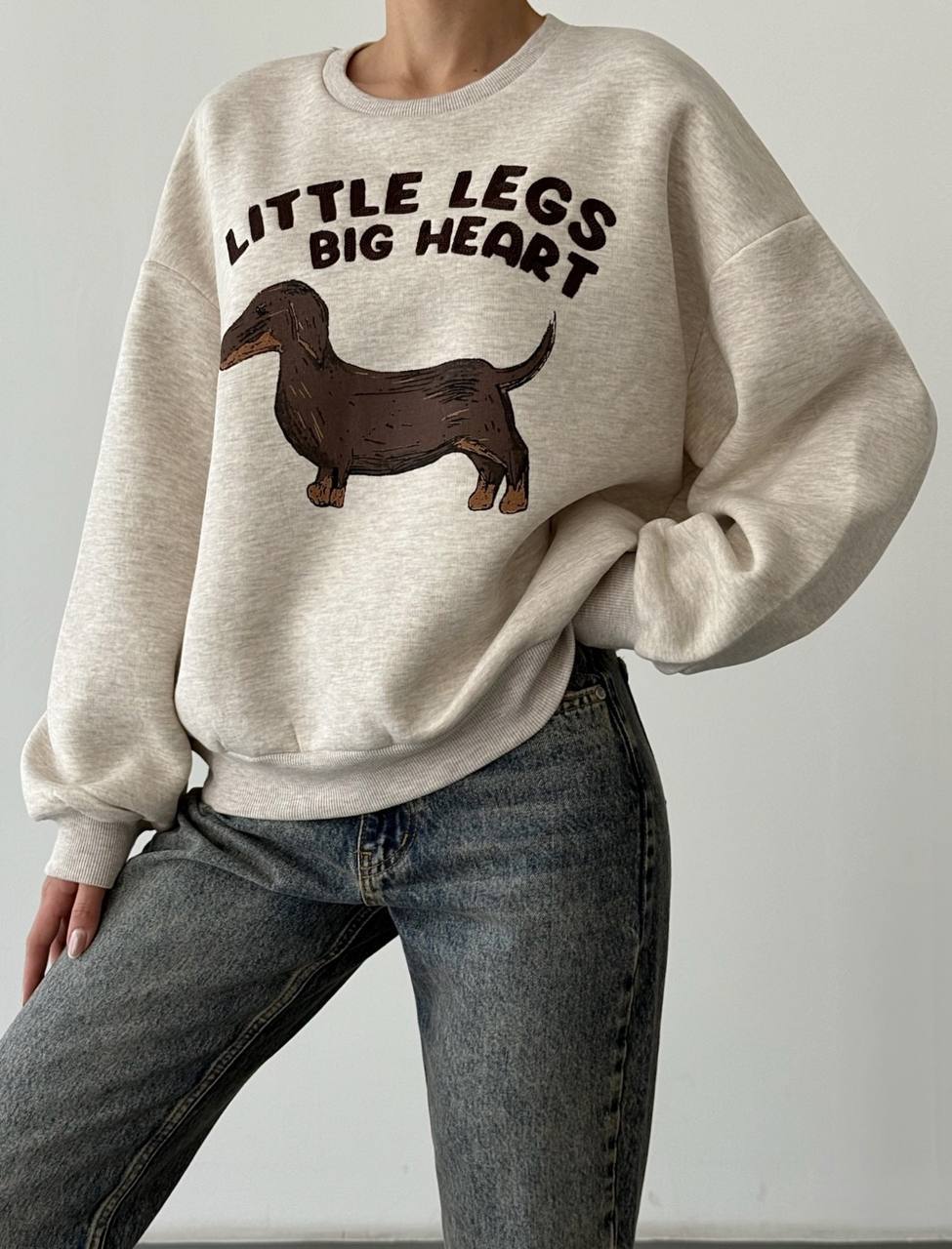 اگر به دنبال یک دورس زنانه اسپرت و راحت برای استایل روزمره هستید، این مدل انتخابی ایدهآل است. طراحی مینیمال با چاپ فانتزی سگ و نوشته "Little Legs Big Heart" جلوهای خاص و دوستداشتنی به این سویشرت داده که آن را به یک آیتم ترندی تبدیل کرده است.
