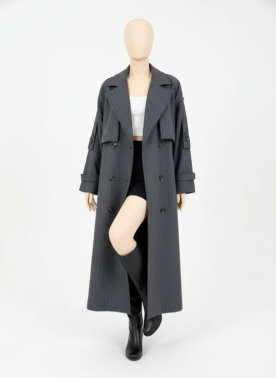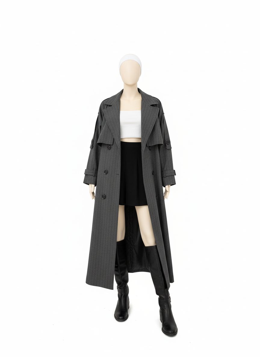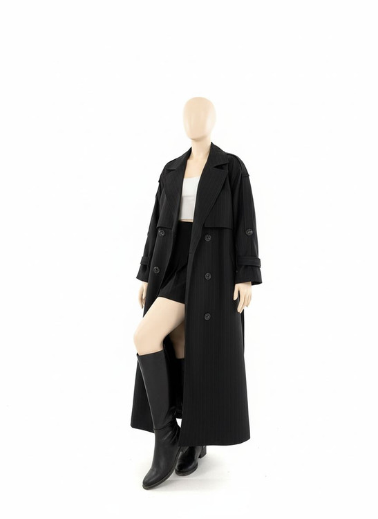 ترنچ کت طرح دیپلمات با راهراههای ظریف عمودی، انتخابی شیک برای استایلهای رسمی و نیمهرسمی است. این مدل با برش ساختارمند، یقه انگلیسی پهن و طراحی دکمهدار جلو، حالوهوای کلاسیک کتهای رسمی را با فرم بلند و مدرن ترنچ ترکیب میکند.